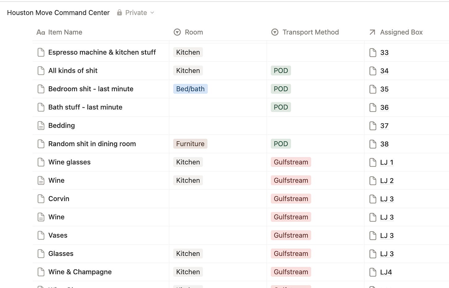 To manage my move across the country, I used Notion to create a “Houston Command Center.” Within the Houston Command Center, I developed three separate databases. They were labeled Tasks Tracker, Item Inventory and Route, and Box and Container Log. It was an absolute work of art … if, like me, you geek out about such things.