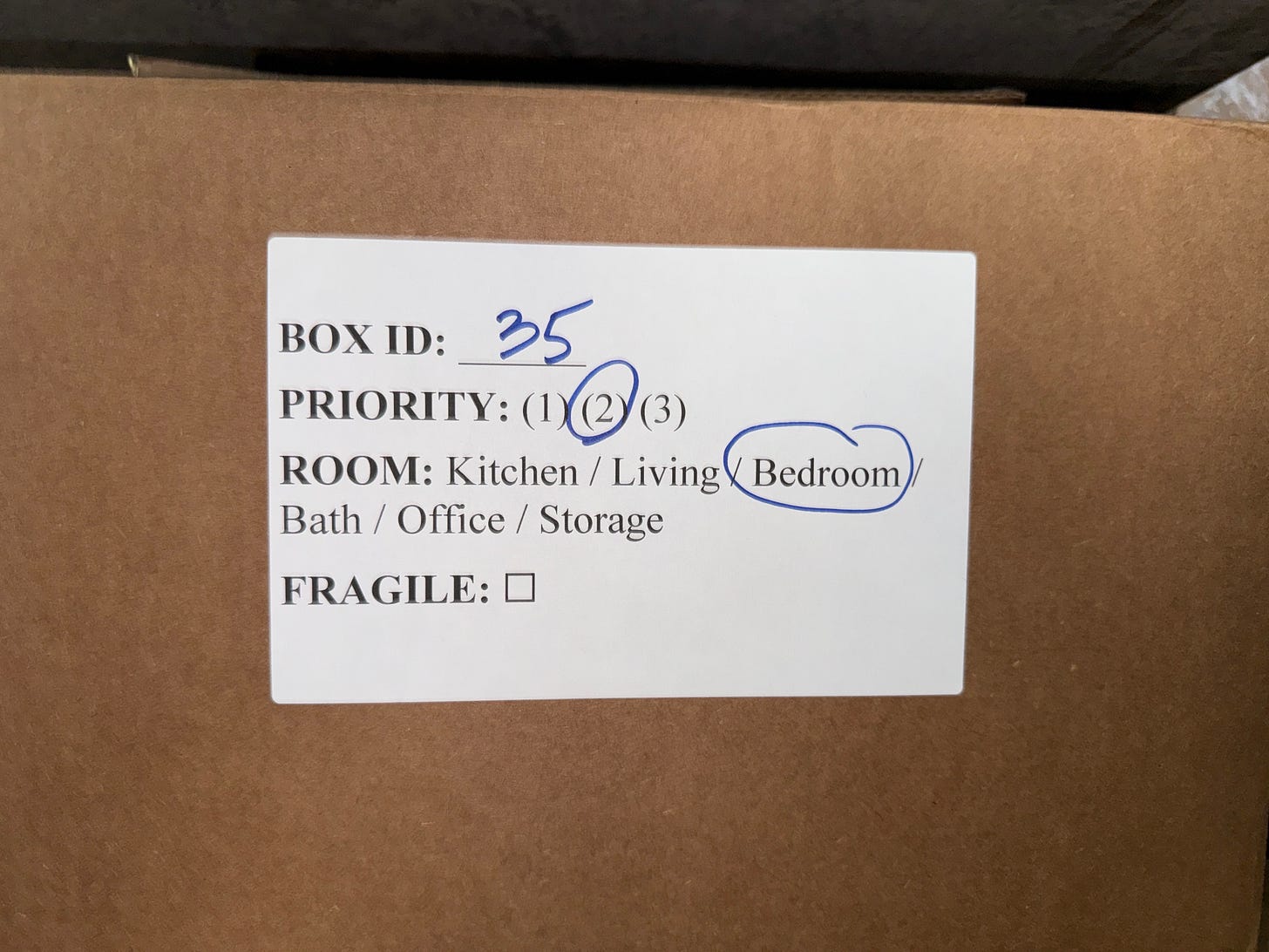 The moving guys didn’t give a damn about my elegant system. They simply wanted to finish the job and go home. They paid no attention to the labels. There was no sorting of the boxes by room. My priority system was meaningless to them. Did the box make it into the apartment? Yes? Then shut up and pay me.